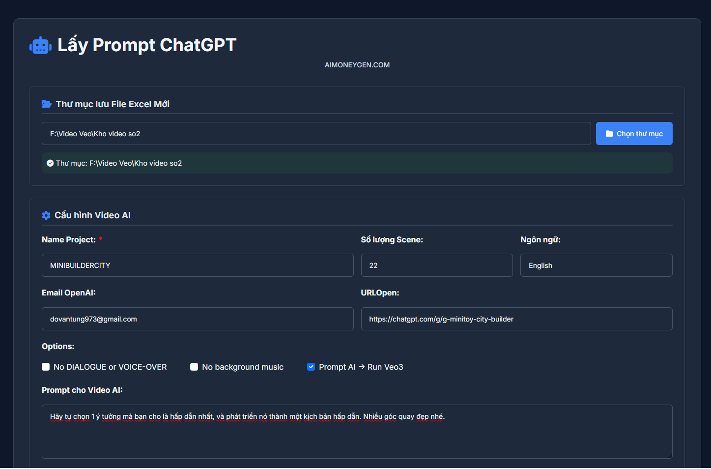 2. Mở AutoVeos → Chọn thư mục → Nhập link GPT → Nhập Prompt