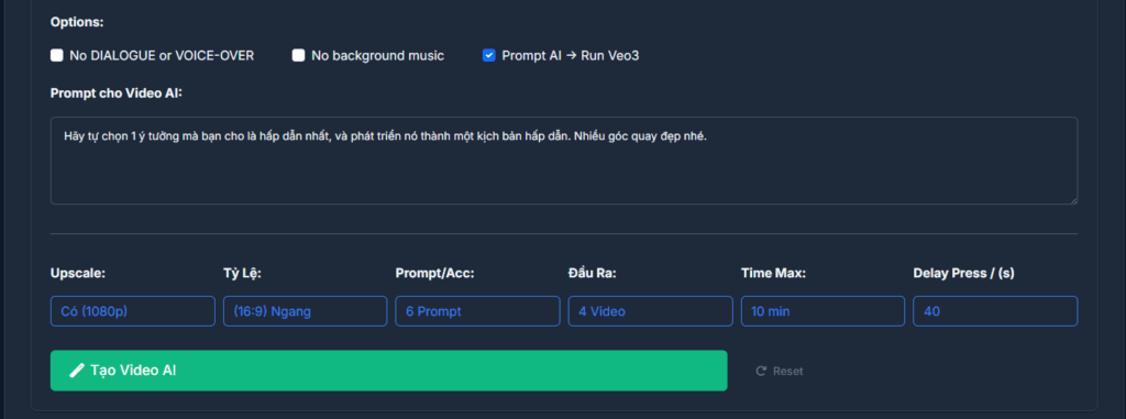 • Prompt AI → Run Veo3 – Nếu tích, AutoVeos sẽ tự chạy tiếp Veo3 sau khi lấy Prompt