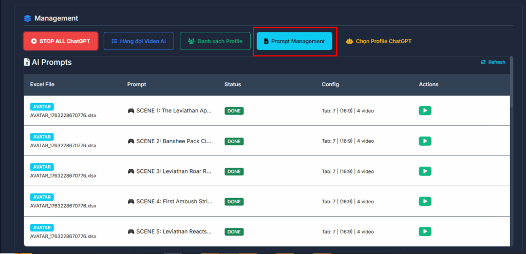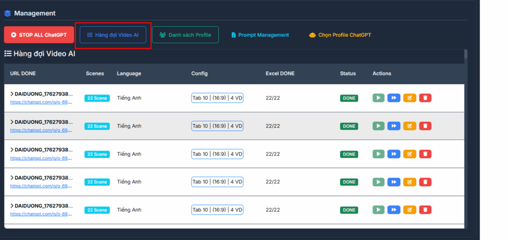 Module này cho phép bạn tự động mở các profile trình duyệt, truy cập vào ChatGPT Custom GPT của bạn, gửi prompt – và tự động lấy toàn bộ kịch bản AI về dạng Excel để đưa vào quy trình AutoVeo3.