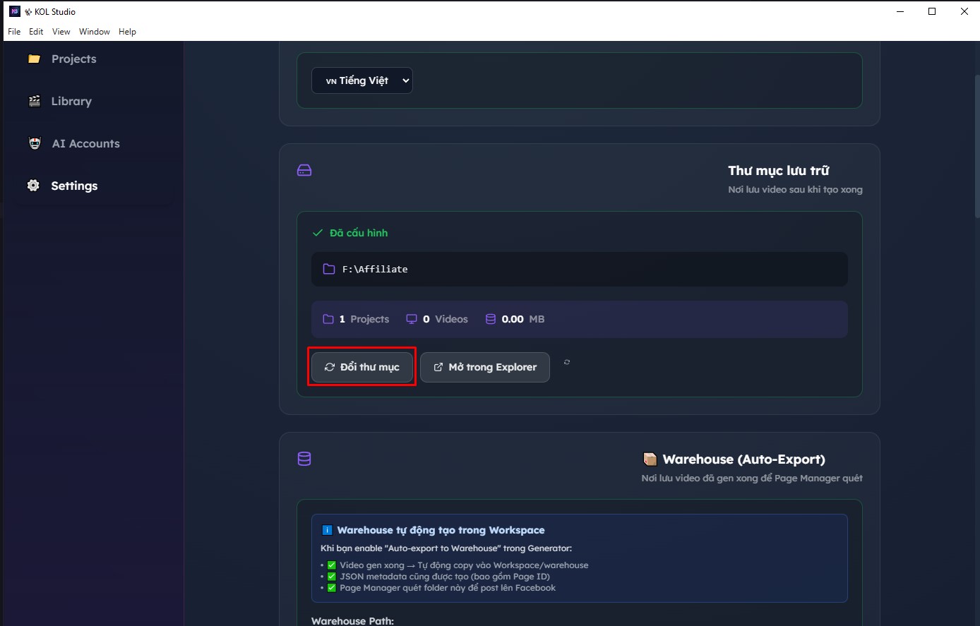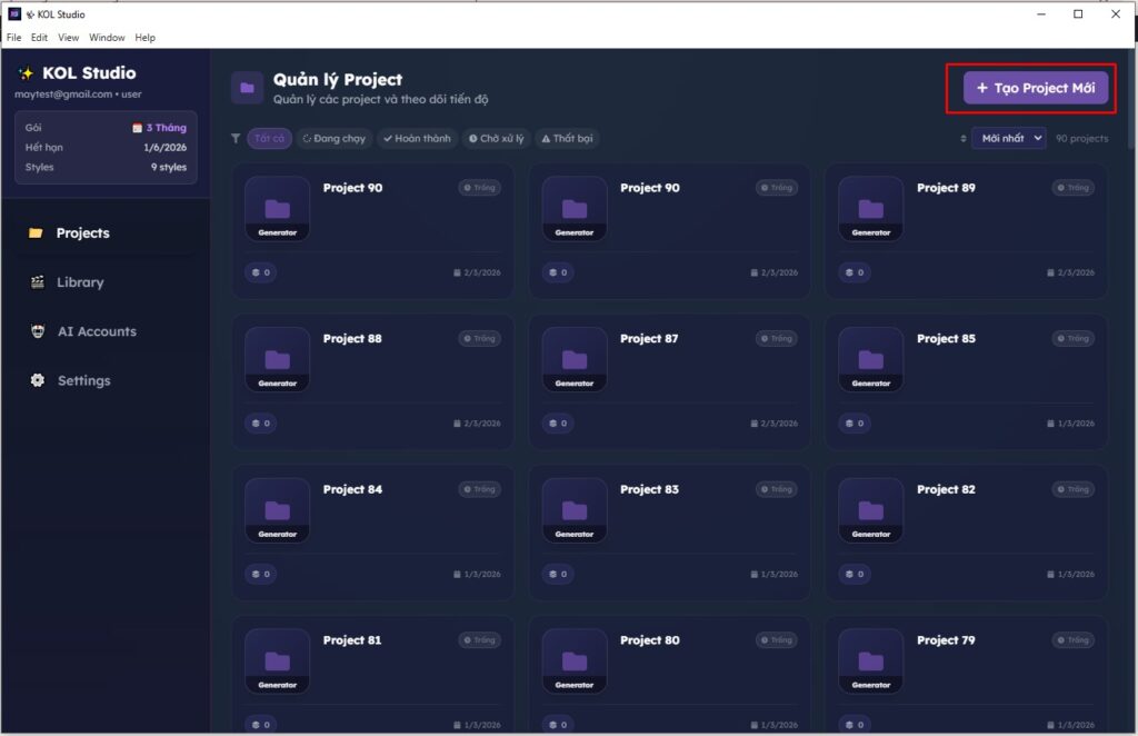 Đây là nơi KOL Studio lưu tất cả project và video của bạn.