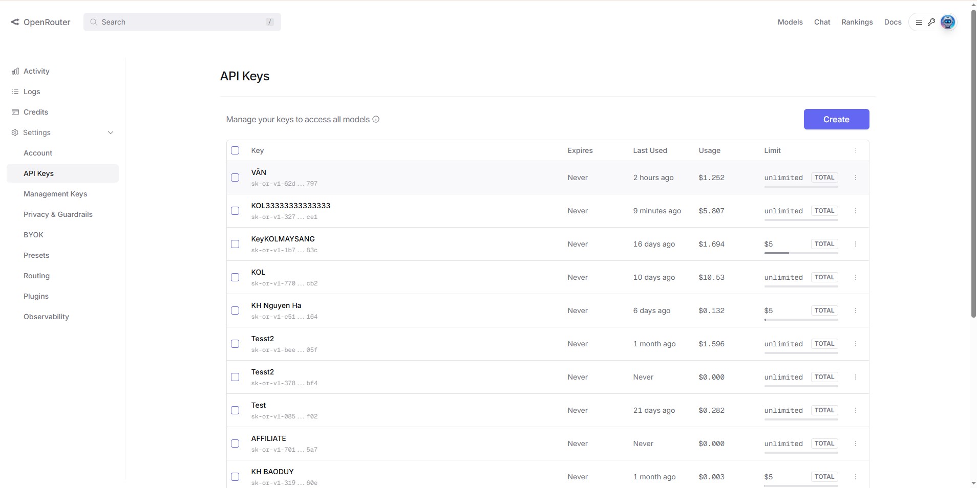 5. Copy key vừa tạo (dạng sk-or-v1-...)